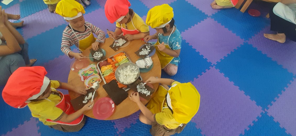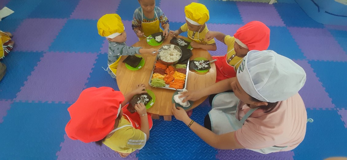 Kimbap được xem là món ăn hấp dẫn và đặc trưng của nền ẩm thực Hàn Quốc. Là sự kết hợp hài hoà giữa các nguyên liệu tự nhiên như rong biển, cơm, rau củ, thịt trứng...rất là hấp dẫn. Dưới sự hướng dẫn của cô và đôi bàn tay nhỏ nhắn của mình, các bé trường Mầm non Vĩnh Tiến đã trổ tài và hoàn thành xuất sắc: Trải đều cơm lên mặt rong biển, thêm trứng chiên, cà rốt, dưa chuột, xúc xích rồi cuộn tròn lại. Bé thật là vui khi được thưởng thức món ăn tự mình làm, ăn rất ngon miệng ạ.