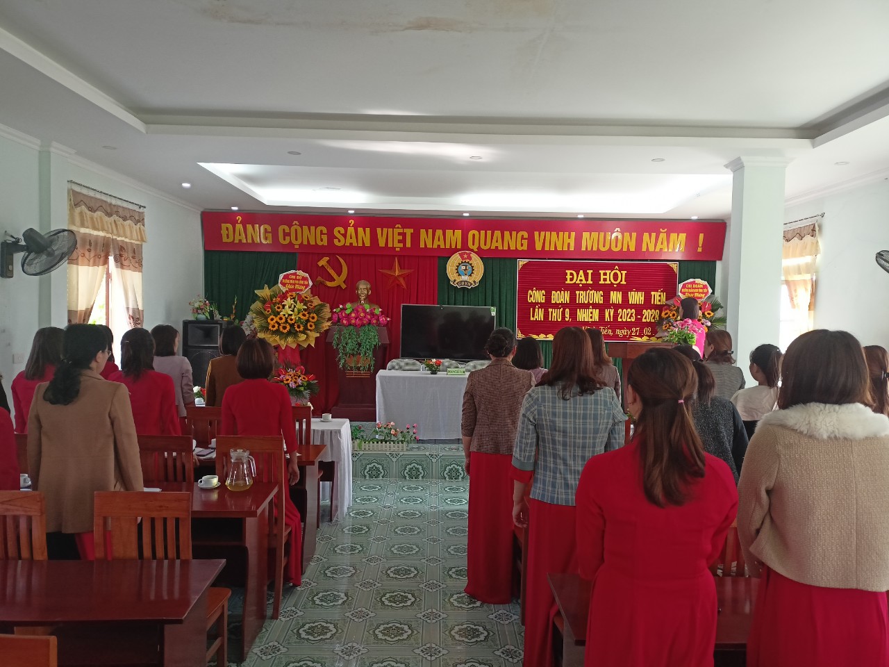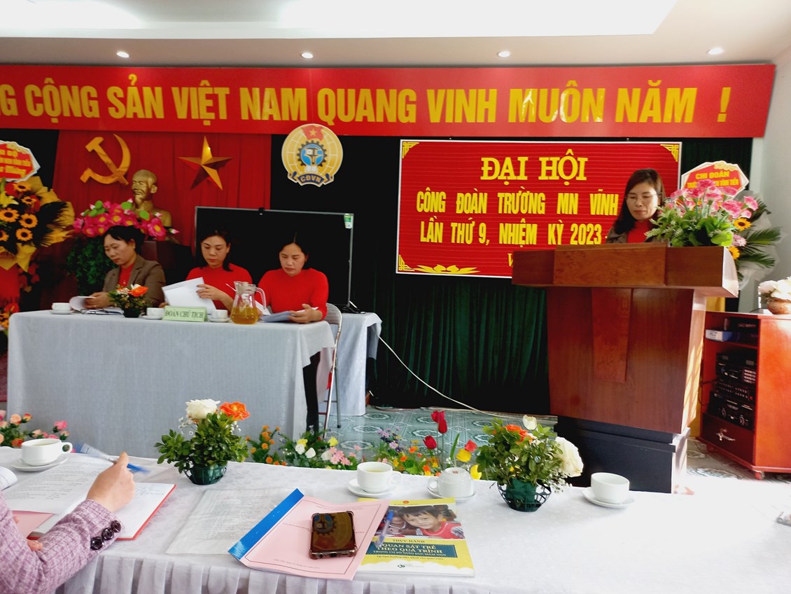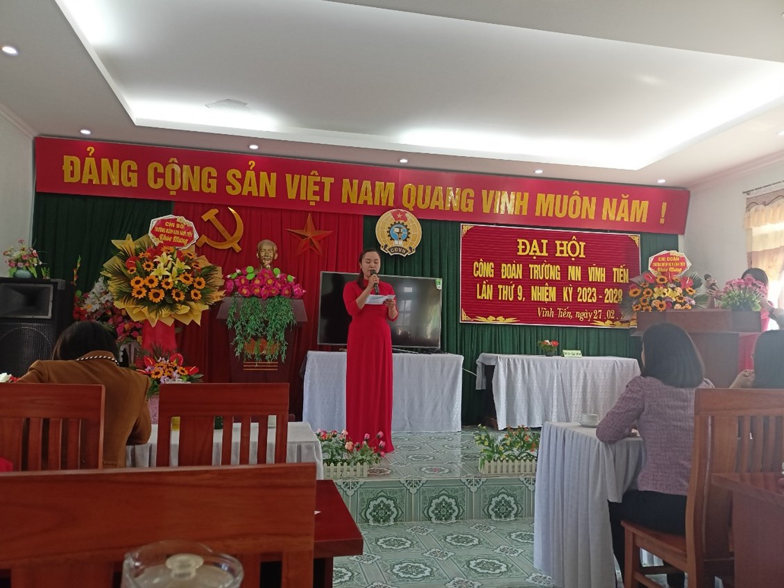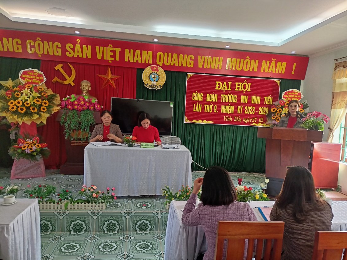 Tại Đại hội, các đại biểu được nghe đồng chí Chủ tịch Công đoàn khóa VIII nhiệm kỳ 2017-2022 báo cáo tổng kết đánh giá thực chất phong trào CNVCLĐ và hoạt động công đoàn nhiệm kỳ 2017-2022. Phân tích những mặt mạnh để phát huy, những tồng tại để khắc phục, tìm ra nguyên nhân và rút ra những bài học kinh nghiệm, trên cơ sở đó xây dựng mục tiêu, phương hướng nhiệm vụ nhiệm kỳ tới sát với tình hình nhiệm vụ của địa phương. Cũng tại Đại hội, các đại biểu được nghe tham gia ý kiến vào báo cáo của BCH LĐLĐ huyện Vĩnh Bảo khóa 9 trình tại Đại hội Công đoàn huyện Vĩnh Bảo lần thứ 10 và bầu Ban chấp hành công đoàn khóa mới, chức danh Chủ tịch công đoàn trường Mầm non Vĩnh Tiến khóa 9 nhiệm kỳ 2023-2028.