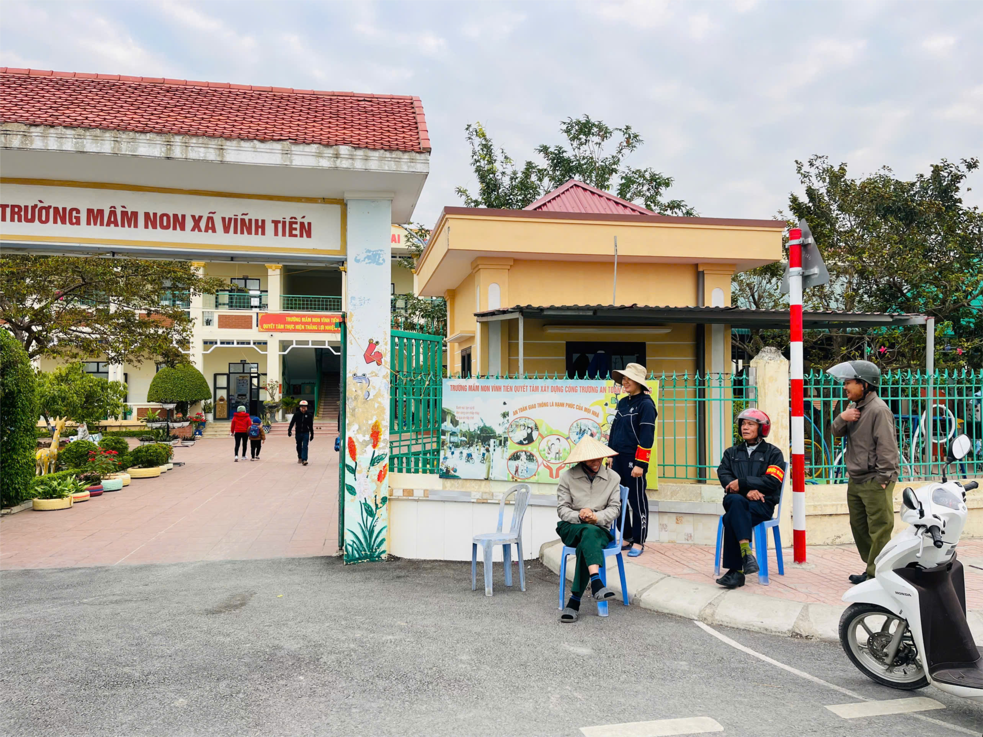 Hàng ngày vào giờ đón và trả trẻ tại cổng trường Mầm non Vĩnh Tiến các cô giáo được phân công lịch trực kết hợp bác bảo vệ, ban công an xã thay nhau trực rất nghiêm túc, nâng cao ý thức chấp hành luật lệ giao thông của phụ huynh.